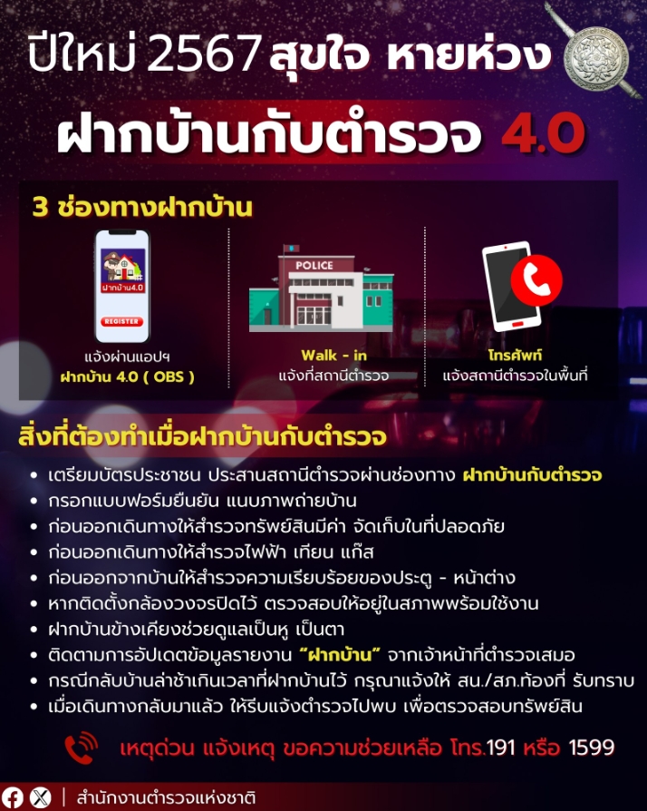 หยุดยาว เดินทางไกลฝากบ้านไว้ให้ตำรวจดูแล.เริ่มแล้ว ฝากบ้านกับตำรวจ 4.0 ปีใหม่ 2568 สุขใจ หายห่วง ฝาก